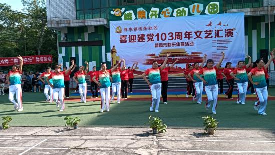 舞蹈表演 活动激昂雄壮的开场舞蹈《永远的赞歌》拉开序幕。随后,大鼓秧歌舞蹈《又见山丹丹花开红艳艳》,群舞《唱支山歌爱中华》将红色元素拉满。观众们同唱红歌,报以热烈掌声。 丰富多彩的节目依次呈现,《情系南京》、《众人划桨开大船》、《战马》、《你是我的城堡》不断将欢乐气氛推向高潮。《我爱桃花我爱家》、《我是一条小河》、《爱我中华》,合唱《没有共产党就没有新中国》、《团结就是力量》等节目,彰显了新时代居民的红心红情怀。 开心节目让观众开怀大笑。小品《我要吃低保》、《王小二打广告》既贴近生活,又反映了基层现状。 经典诗词朗诵《沁园春·雪》、《长征·七律》让人感受到革命乐观主义精神,激励着每个人踔厉前行。