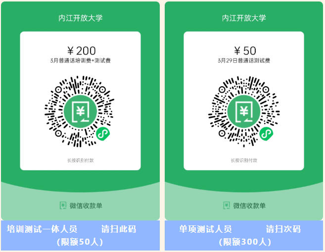 04 四、报名方式 请考生根据个人需求,自行选择培训测试一体或单项测试,微信扫码报名、填表、缴费(所填信息必须准确无误,否则影响后续测试)。 报名、缴费二维码 ![]() 注意:上次测试成绩未出的考生(或已在其它测试站报名的考生),不能参加本次报名。考生请务必确认自己能参加测试再报名,报名缴费成功后不能退款和更改考试时间。 05 五、准考证打印 报名、缴费成功的考生于2026年3月23日起在网上自行打印准考证(网址:bm.cltt.org),进入网站后点击“打印准考证”,输入姓名和身份证号码方可打印。 06 六、费用 按照《四川发展和改革委员会 07 七、成绩查询 测试结束30天左右,百度搜索“畅言网”,进入点击“全国普通话成绩查询”,选择“四川省”,输入考生姓名和身份证号码查询成绩。或关注微信公众号“内江开放大学”或“内江普通话培训测试”查询成绩。 08 八、证书领取